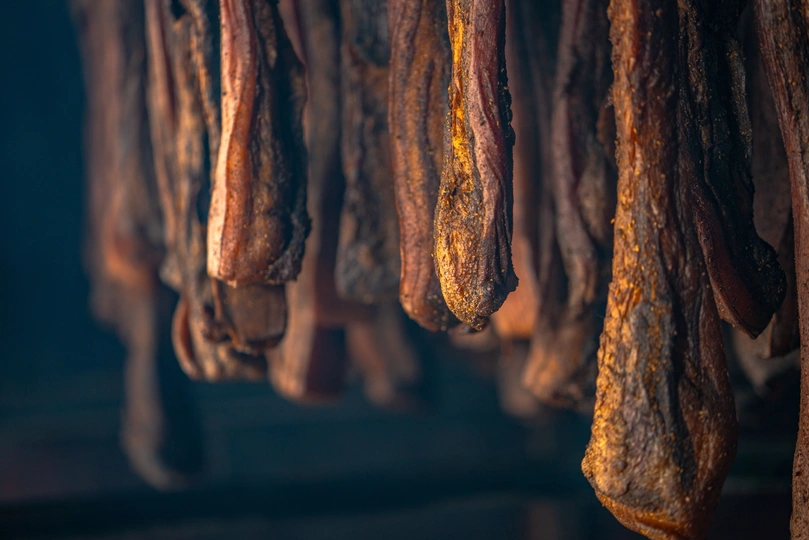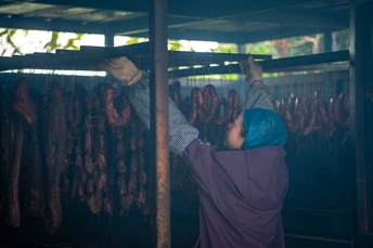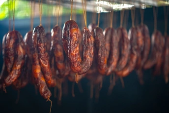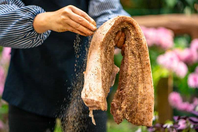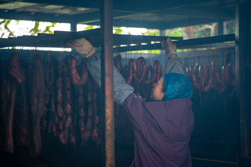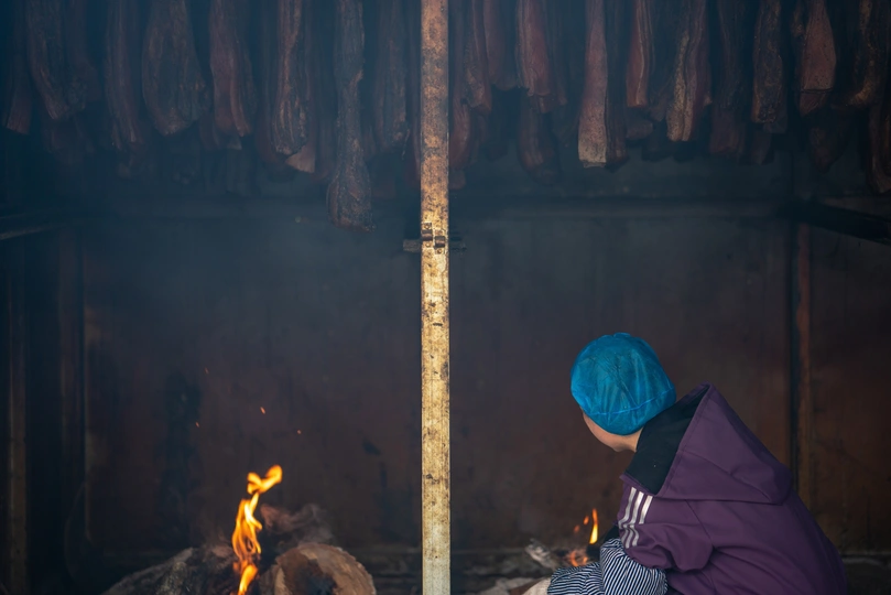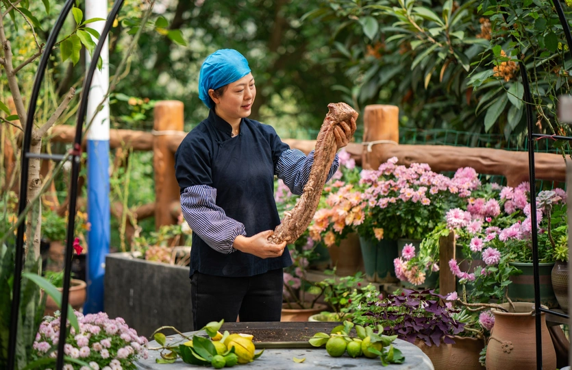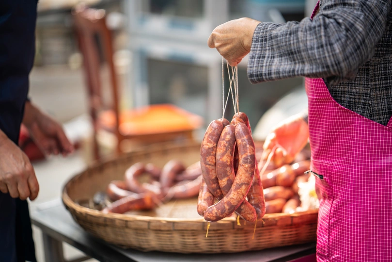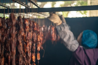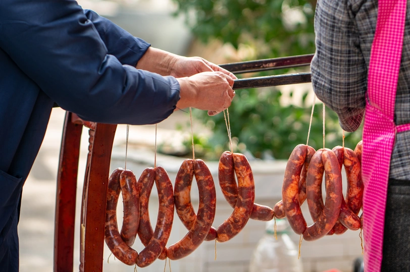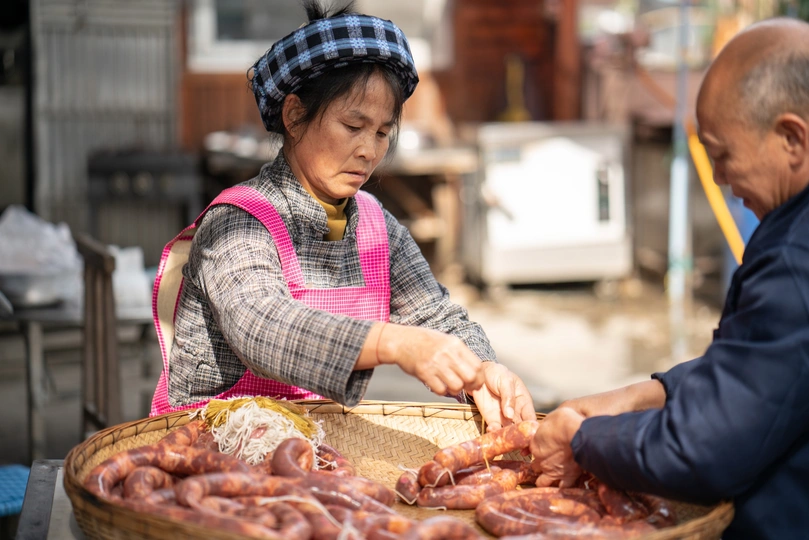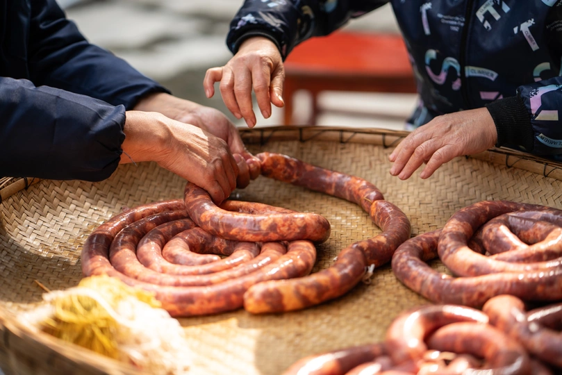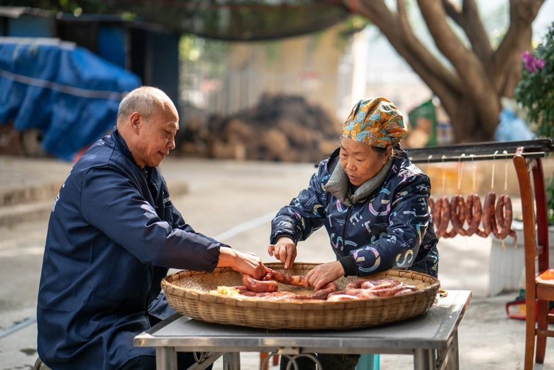 2025年12月13日,贵州省黔西南布依族苗族自治州望谟县蔗香镇蔗香村,冬日暖阳洒满红水河畔的蔗香村,鲜花盛开的小院,布依群众迎来腌制熏烤年货腊味的忙碌时节。 蔗香村是依偎在红水河畔的布依族村寨,山水环绕、物产丰饶。每年冬月,当地布依族村民都会精选散养土猪肉,切成肉块或剁成肉糜,加入新鲜柠檬汁、食盐、花椒等调料充分腌制入味,再手工灌制香肠、悬挂腊肉。当地熏烤环节尤为讲究,村民们选用当地盛产的橡树枝、柠檬皮、甘蔗渣等果木为燃料,在熏房内慢火熏烤数天。果木的清香与肉香深度融合,赋予腊味独特的酸甜口感与醇厚风味。这份承载着布依饮食智慧与河畔风情的腊制品,不仅是家家户户必备的年味,更成了备受省内外消费者青睐的畅销年货。