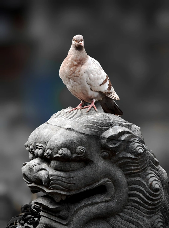 鸽子飞到石狮头上,留下痕迹,狮子抓狂的表情