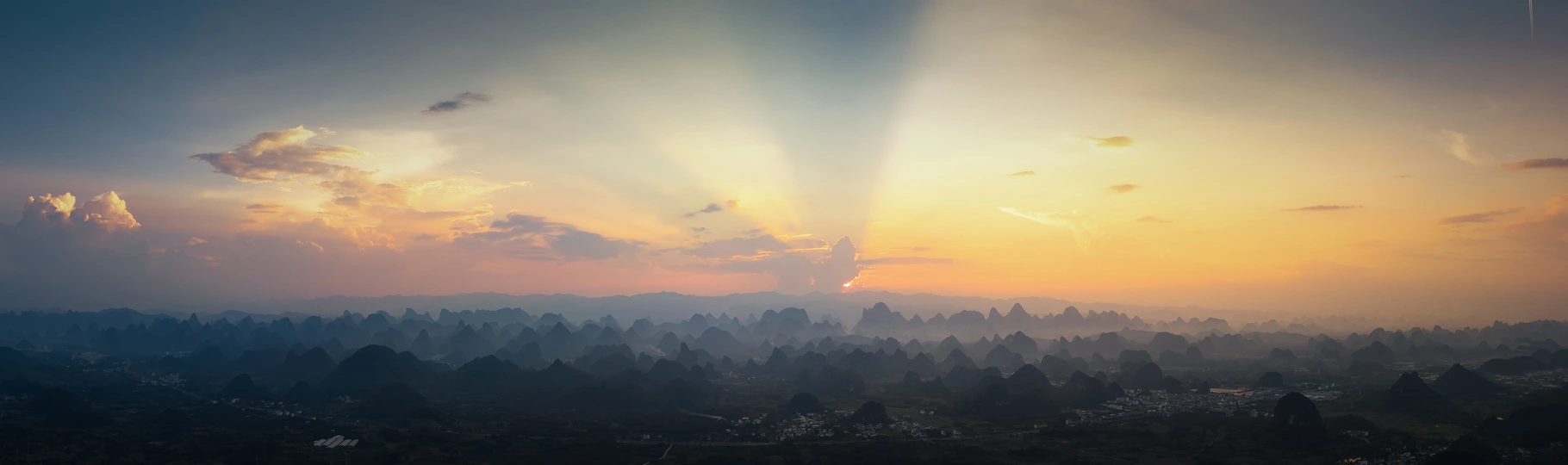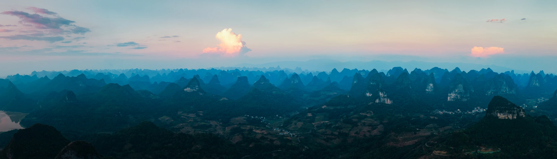 乘车奔赴阳朔夕阳山大型水墨画摄影基地,拍摄了这组以喀斯特峰林为底色、复刻北宋名画意境的观景地集群.非常幸运的是在同一天,我拍到了不同光影的千里江山图。云雾轻笼时,峰林如淡墨晕染的画稿,虚实间复刻着传统山水里 “远看取其势” 的留白质感。暖黄夕照时,光柱穿透云霭铺陈在层叠峰峦间,暖调光晕裹着峰林的轮廓,像被打翻的金箔融在山影里;蓝调暮色时,黛色峰丛与粉紫云霞晕染出清寂氛围感,隐现的村落又织入几分烟火暖意。随着太阳的落山,群山逐渐隐去,可以说最佳的拍摄时间就是日落前后的黄金1小时,当你俯瞰层叠峰林,随手拍都是 “行走在画里” 的质感。