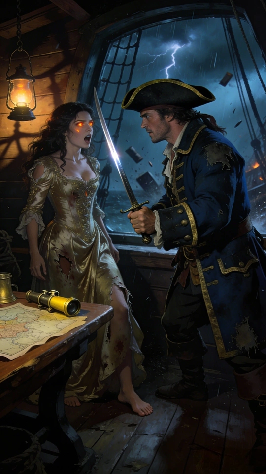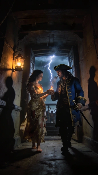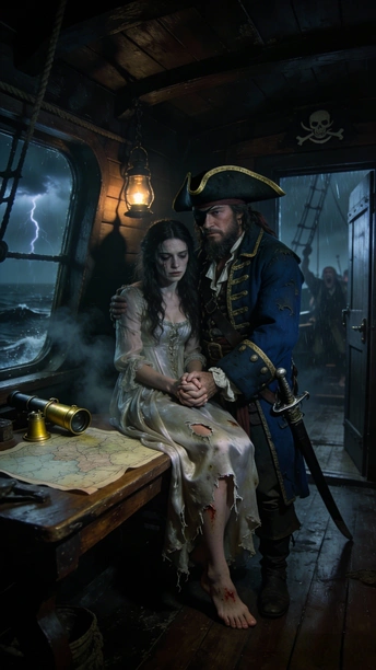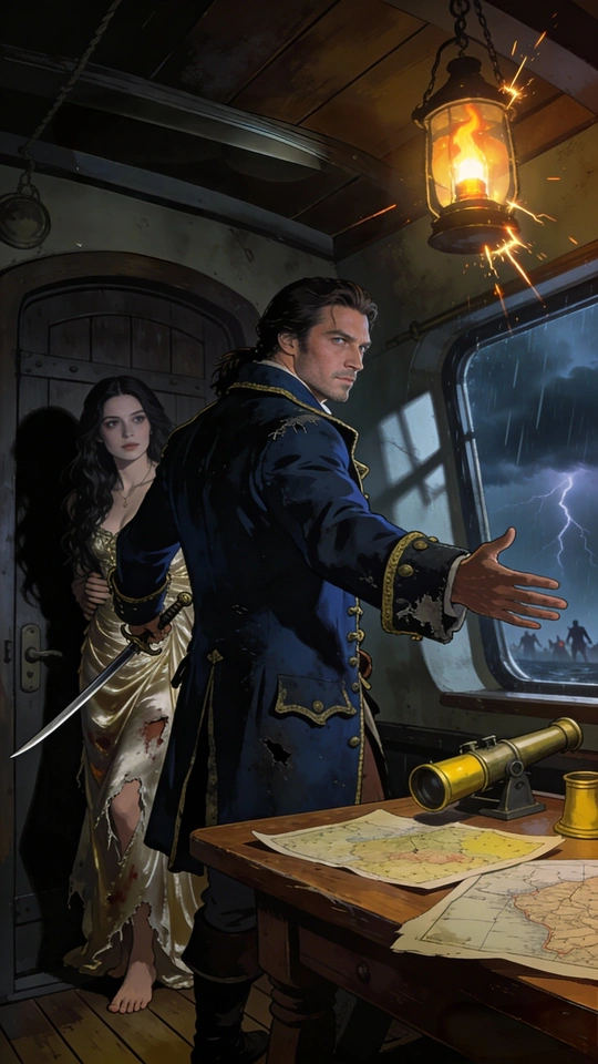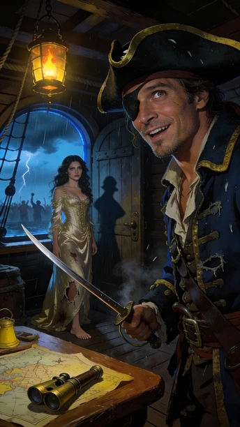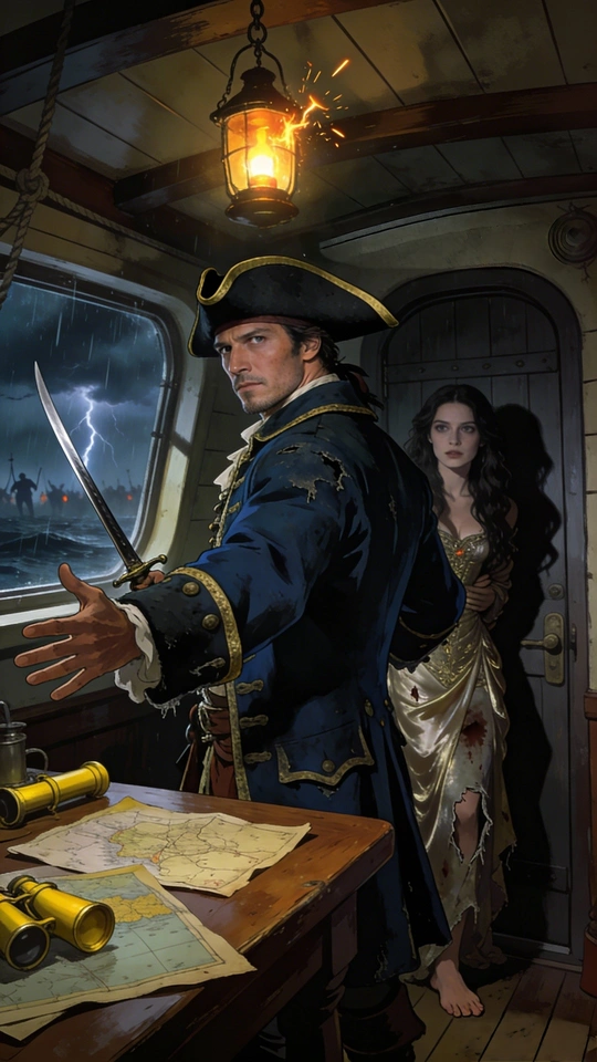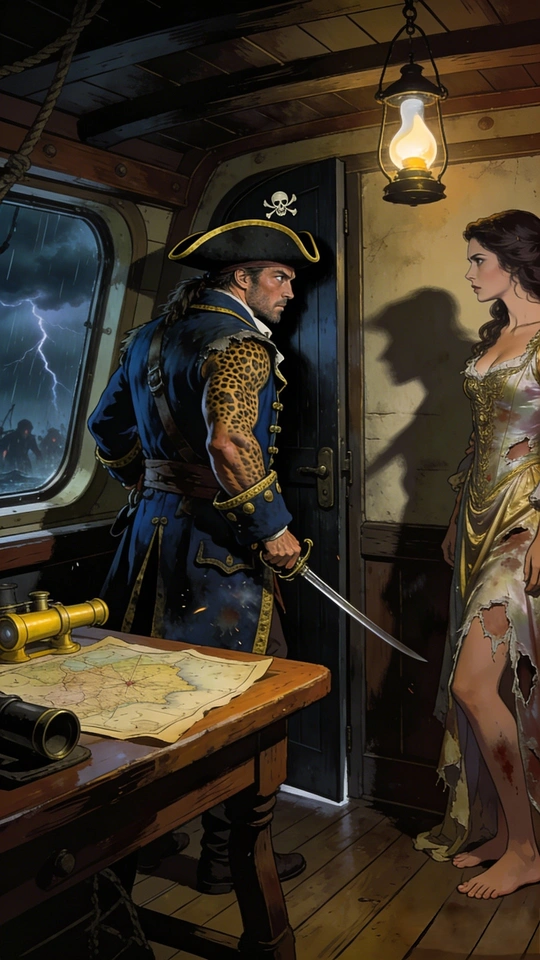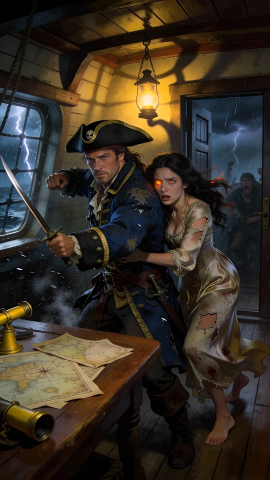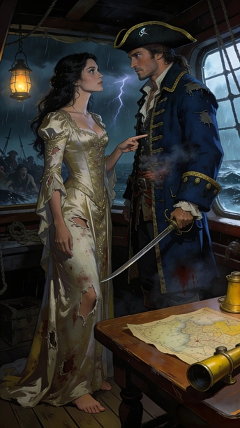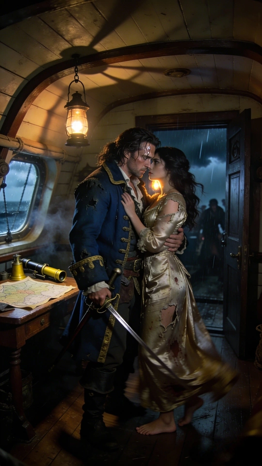 剑刃挑着残阳 海盗的靴跟钉住甲板 每道伤疤都在风里 亮成警惕的星 她的裙裾碎成浪的形状 贴紧他的脊背 像未拆封的秘密 藏着盐粒与月光 彩色的光漫过船舷 老罗盘转着无声的诗 他的影子罩住她 一半是铠甲 一半是温柔的墙 风掠过发梢时 剑未入鞘 心已归航