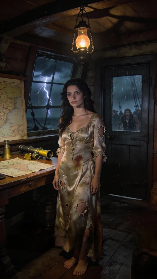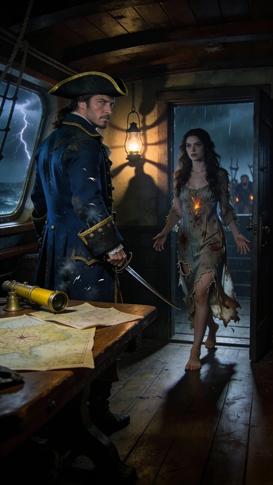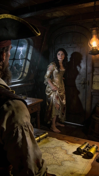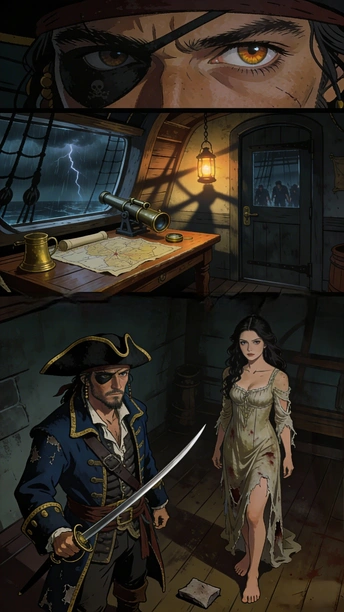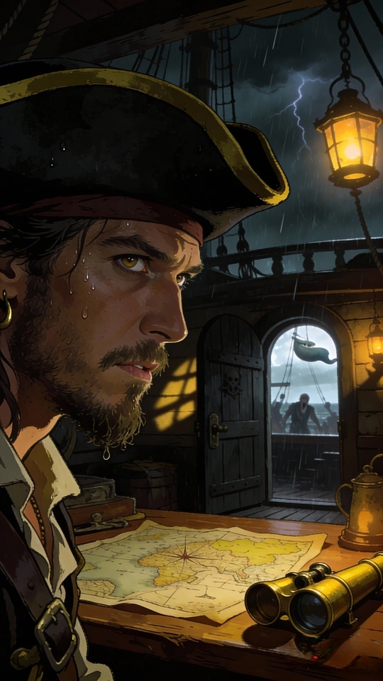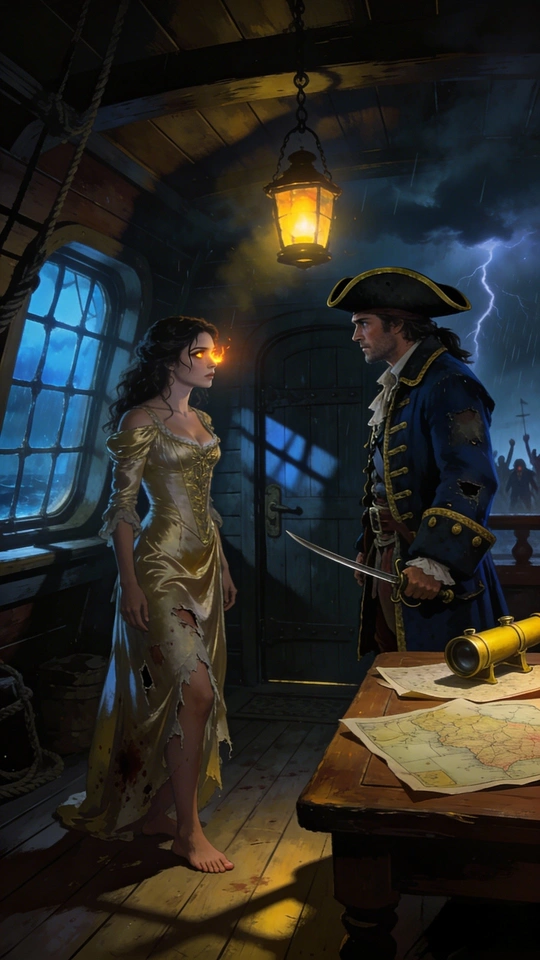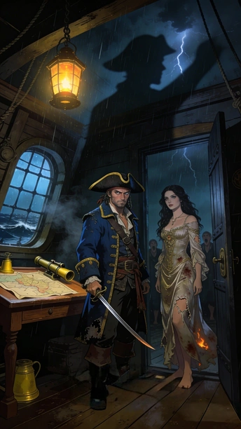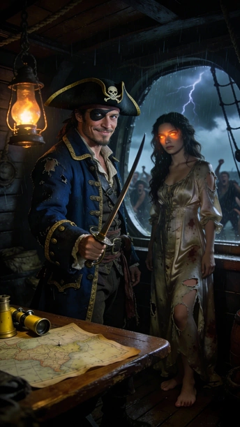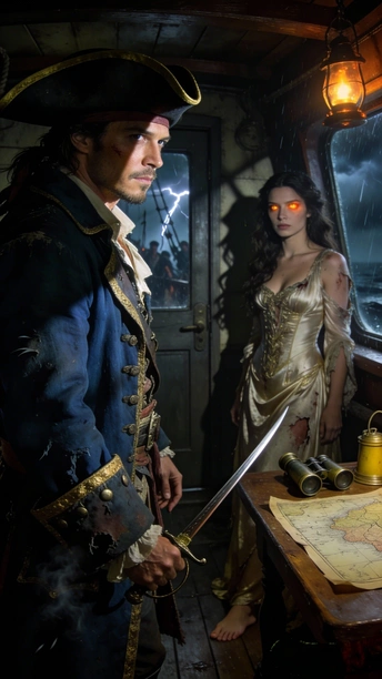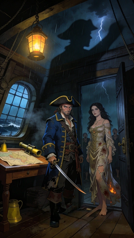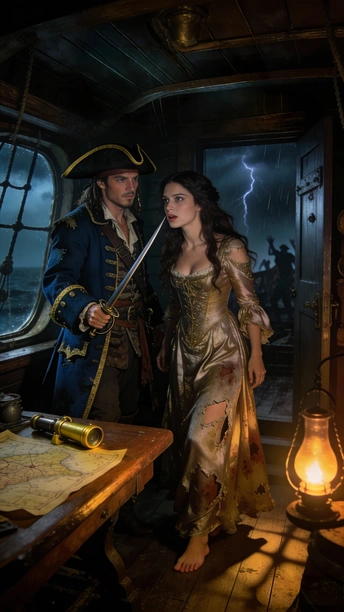 剑刃挑着残阳 海盗的靴跟钉住甲板 每道伤疤都在风里 亮成警惕的星 她的裙裾碎成浪的形状 贴紧他的脊背 像未拆封的秘密 藏着盐粒与月光 彩色的光漫过船舷 老罗盘转着无声的诗 他的影子罩住她 一半是铠甲 一半是温柔的墙 风掠过发梢时 剑未入鞘 心已归航