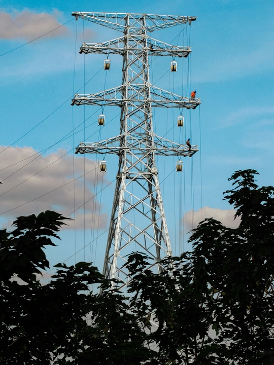 高压电塔直插云霄,蓝天下导线如银丝交织,似云端织网。工人身着橙红安全服,悬于百米高空,脚下是摇曳的金属框架,头顶是翻涌的云海。他每一步都踏在生死边缘,用双手编织电力脉络,在危险与使命间架起无形桥梁,守护着城市的万家灯火。