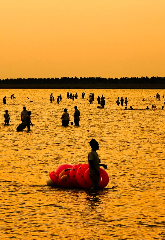 夕阳将河面染成流动的金箔,游泳者如星子散落其间。近处商人贩卖游泳圈,孩童正与水花嬉戏;远处树影婆娑处,成人或仰泳观云,或俯身触水。粼粼波光中,剪影般的身影与暖调光线交织。