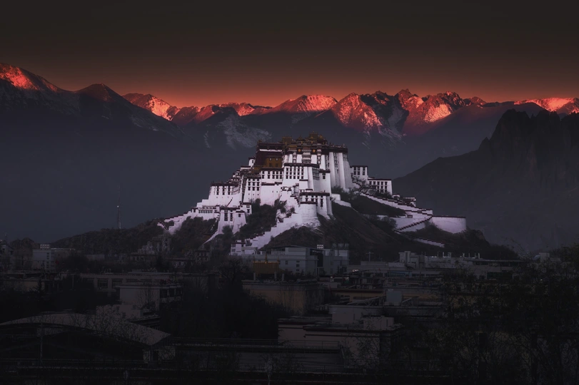 当第一缕晨曦吻上白墙金顶,布达拉宫在群山怀抱中缓缓苏醒。光与影在山脊流淌,绛红宫墙染上琥珀色的柔光,仿佛千年信仰在黎明中低语。远山如黛,云雾似纱,这一刻的庄严与温柔,凝固成雪域最静默的诗篇。
