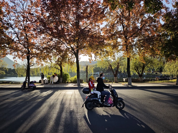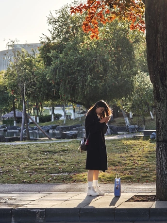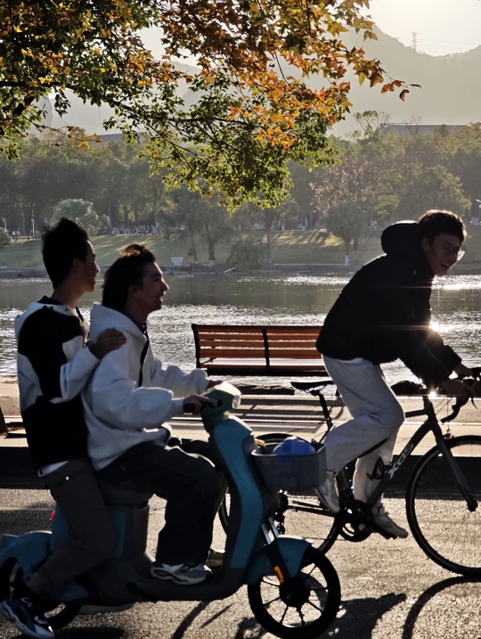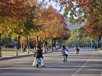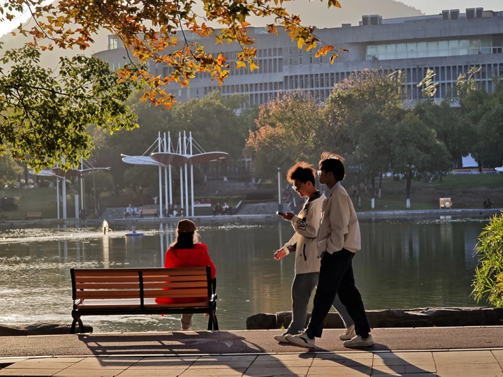 这组九宫格照片定格了秋日校园的鲜活瞬间:金黄与赤红的秋叶铺满道路,阳光透过枝叶洒在行人、骑行者的身影上,湖畔的长椅、错落的校园建筑与图书馆的标志性建筑相映成趣,彩色的墙面装饰又添几分活泼,整体画面将校园秋日的自然景致与人文生活交融,满是温暖又充满烟火气的校园氛围。