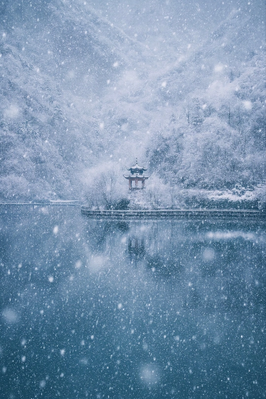 大雪缓缓落下,将群山悄然掩住,原本清晰的起伏山被一点点抹平。亭阁立在风雪之中时隐时现。能见度很低天地仿佛被缩成一隅,只剩下雪落的声响与湖面的微光彼此对望。雪一片片飘下,没有急促也无喧哗静静覆盖四野,把冬日的清冷与孤寂铺展开来,世界因此安静下来……