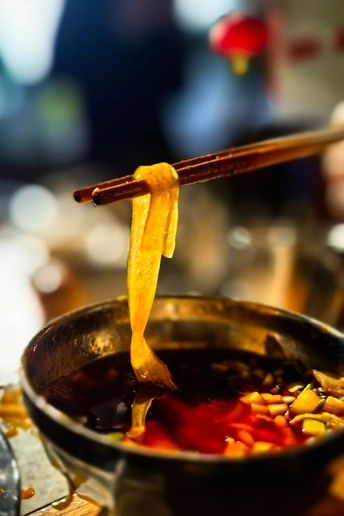 构图以筷子为视觉锚点,构建“垂直线条—圆形碗口—流动面条”的动态平衡。特写镜头聚焦被筷子挑起的橙黄宽面,面条悬垂成优美弧线,汤汁欲滴未滴的瞬间凝固张力,背景虚化的灯笼与食客剪影形成浅景深,让市井烟火成为味觉主角的温柔注脚。 色彩系统充满食欲美学:宽面的琥珀色与红油的绛红碰撞,木筷的棕褐与金属碗的哑光黑形成材质对比,零星蒜粒的乳白点缀其间,如调色盘般还原食物本真色泽。暖色调光影让油花泛着细碎金光,将“家常味”淬炼成视觉盛宴。 情感藏于“未完成的瞬间”:筷子微微颤抖的弧度、面条因重力下垂的褶皱、汤汁即将坠落的悬停状态,共同编织出食客举箸时的期待与雀跃。这种“即将入口”的动态感,比食物本身更能唤醒观众的味觉记忆与生活共鸣。 主题直指“饮食即生活”的朴素哲学:没有精致摆盘,只有粗陶碗、旧木筷和市井小店的模糊背景,却道尽中国人“一餐一饭皆诗意”的生存智慧。画面中每一滴汤汁、每一缕面香,都是对平凡日子最动人的礼赞。 艺术价值在于“以小见大的”:摄影师用微距镜头剥离食物的“果腹属性”,让面条成为线条艺术、汤汁化作色彩媒介,在市井烟火中提炼出东方美学的精髓——原来最伟大的艺术,不在美术馆,而在于生活。