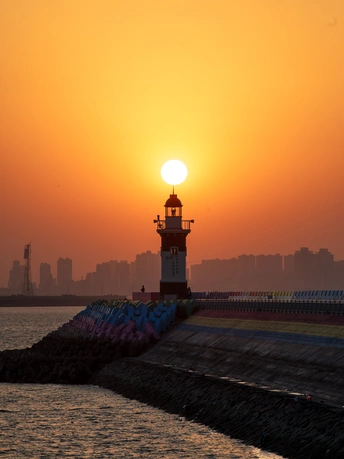 天空被落日晕染成渐变的暖橘色,顶部的灯室恰好与悬于天际的落日重合,形成“太阳为灯塔加冕”的趣味视觉效果。