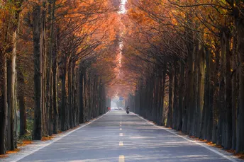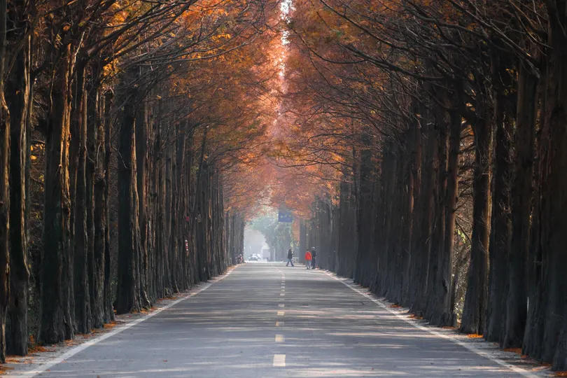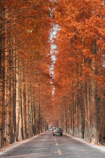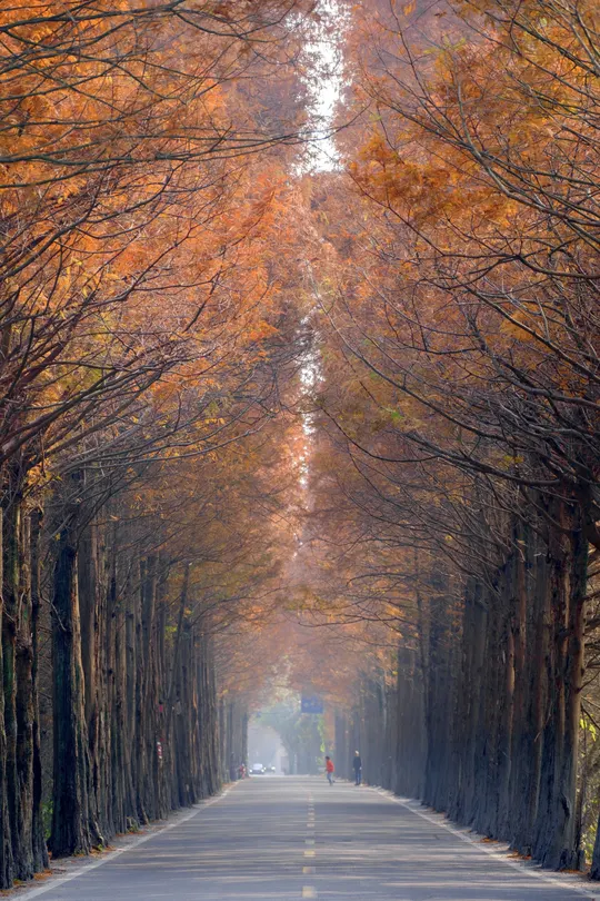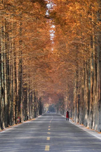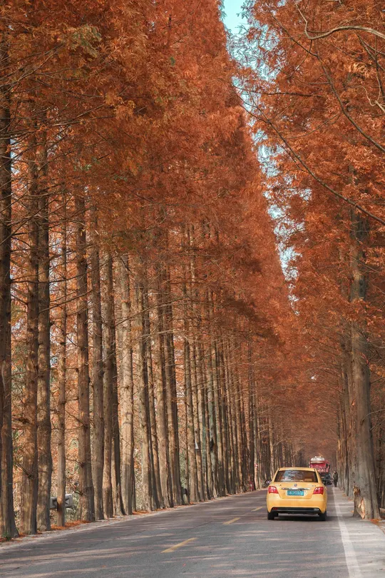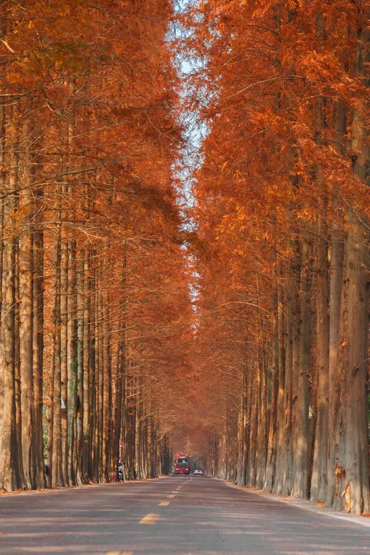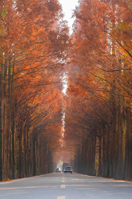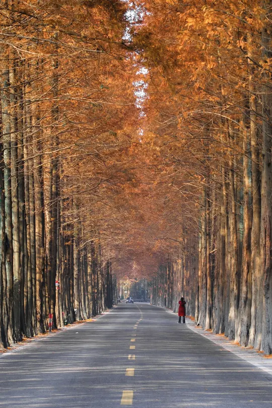 崇州把最浓的色彩,都藏在了中崇路这条绵长的画廊里。水杉褪去青翠,换上红棕的绒袍。阳光从枝叶缝隙穿刺而下,在路面投下摇曳的光斑,当风穿林而过,万千红羽翩然旋落,时间忽然慢了,慢成光影的流速,慢成一片叶从枝头到肩头的距离。好像目的地已不重要,只想让车轮再慢些,好把这三百米的绚烂,走成一个漫长的季节。