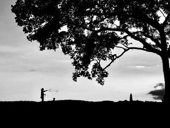孩童的泡泡在光影间轻扬,远处塔影若隐若现,时光在此刻慢下来,是自然与童真的温柔相拥,也是岁月沉淀下的诗意留白~