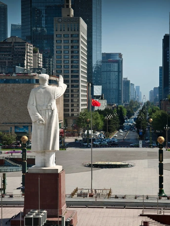 毛主席雕像静立,与身后的现代都市楼宇形成鲜明的视觉碰撞。历史的厚重与城市的蓬勃发展在此交融,雕像的凝望,是对过往的铭记,亦是对时代前行的见证。