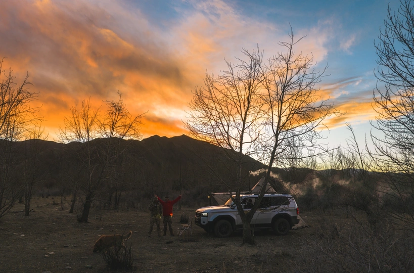冬季露营的蓝调时刻