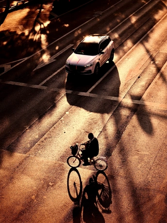 夕阳把马路焙成鎏金的砖, 汽车是滑过的星, 他骑着单车, 影子在身后铺成软缎, 车轮碾过 光的褶皱与树影的斑。 在这暖调的琴键上, 车铃是轻响的音符, 他的前行, 是把黄昏的余温, 揉进 城市脉搏的 节拍里。