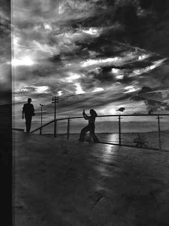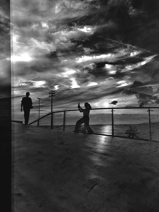天空中云影错落,地面上一人行走、一人记录,体现出两种不同的状态,富有生活感。