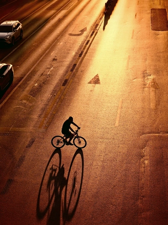 夕阳把马路熔成金箔, 他骑着车, 影子被拉得夸张, 像匹长着巨轮的兽, 与他一同 在光的河流里奔淌。 箭头指向前方, 车轮碾过黄昏的浪, 城市的心跳, 就藏在这鎏金的韵律里, 每一下, 都敲打着 归途的方向。