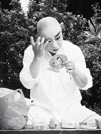 他身着素白,独坐于石台前。一手执镜,镜中映着未干的彩绘;一手蘸着颜料,当皱纹爬上眼角,眉笔仍在勾勒少年郎岁月,而他眸中,总有一折戏,刚开腔。