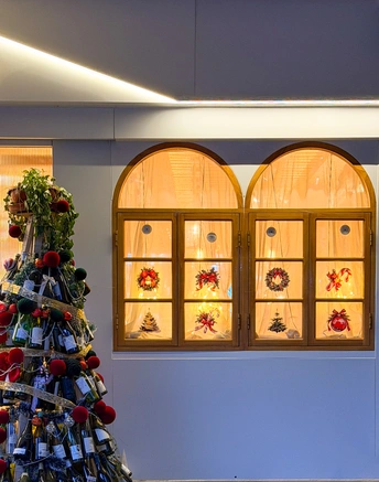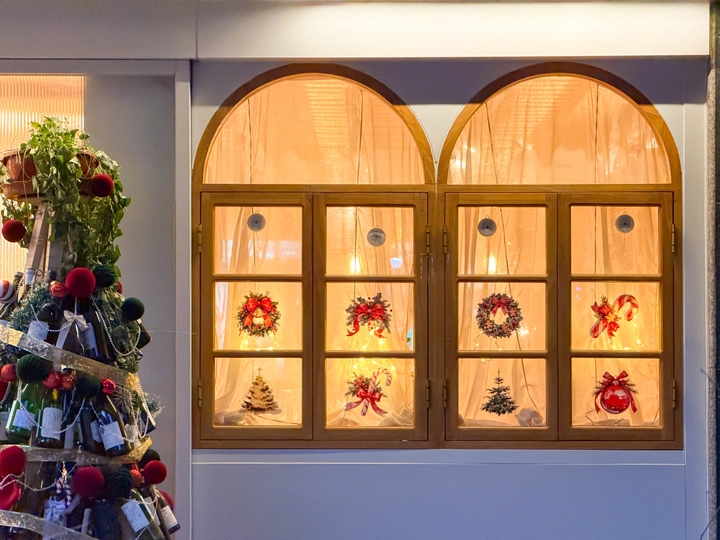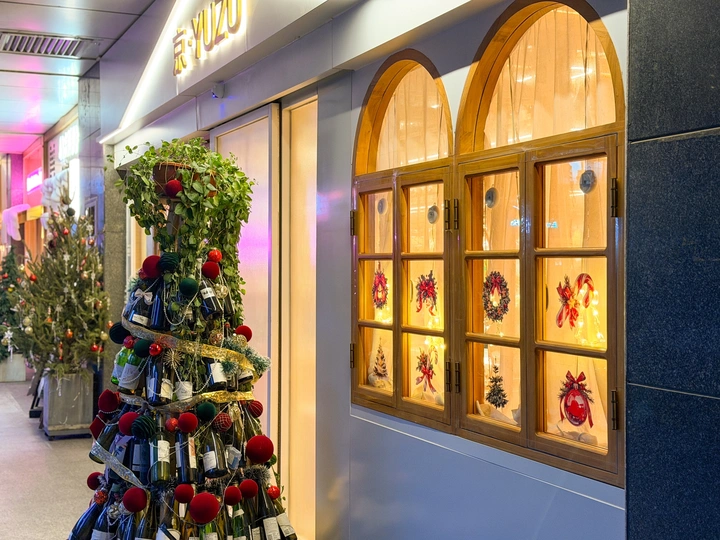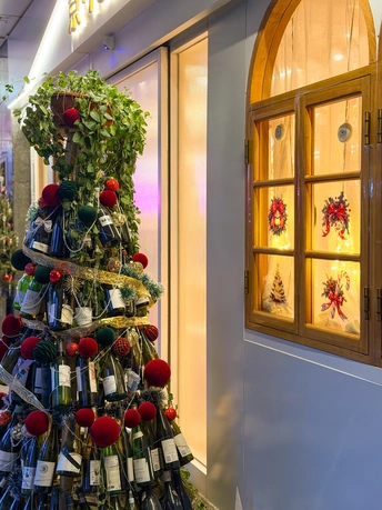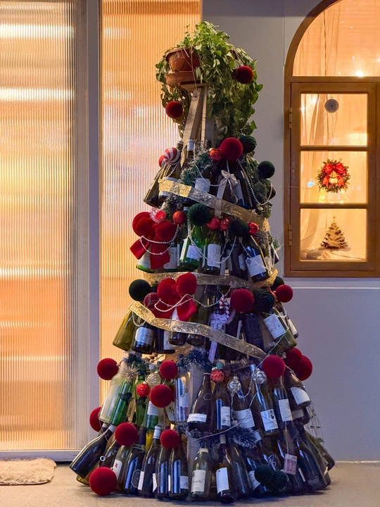 一家小餐馆门外用酒瓶子做的圣诞树和窗户里透出的灯光。