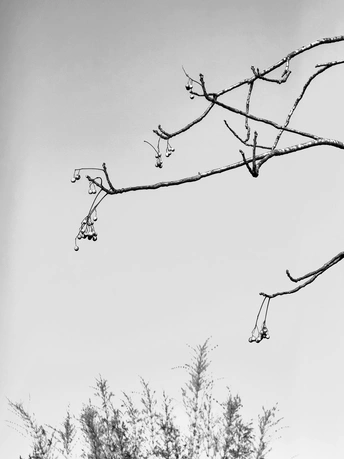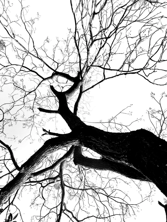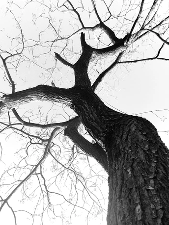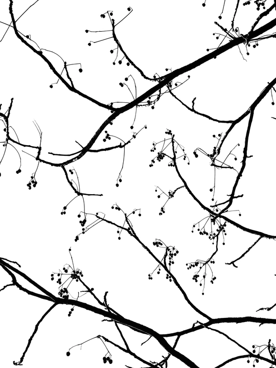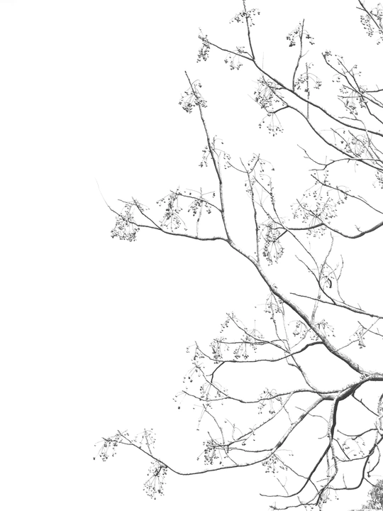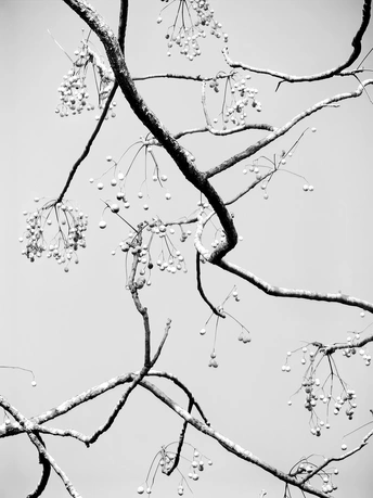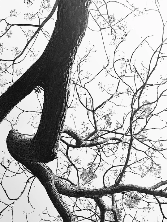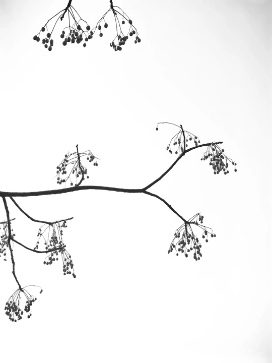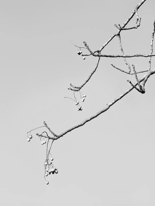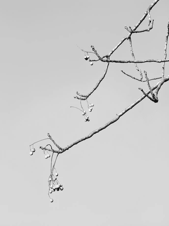 这组图片以黑白高对比的视觉风格呈现,主体是枯寂的树枝与树干的局部特写,被分割为九宫格的版式展示。画面中,深黑的枝干在素白背景的衬托下,线条虬曲交错、疏密有致,粗干的苍劲与细枝的纤柔形成鲜明反差,既带有水墨写意的空灵韵味,又通过极简的色彩和构图,凸显出枝干本身的形态美感与枯寂的意境