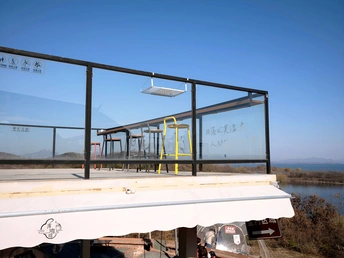 密云水库边一家咖啡馆的户外平台,风轻拂,云漫卷,心宁静,享自然。