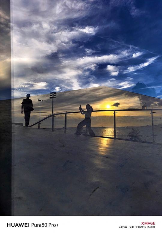 一半是炽热的夕阳,一半是静谧的蓝空。一人驻足定格美好,一人步履迈向远方。