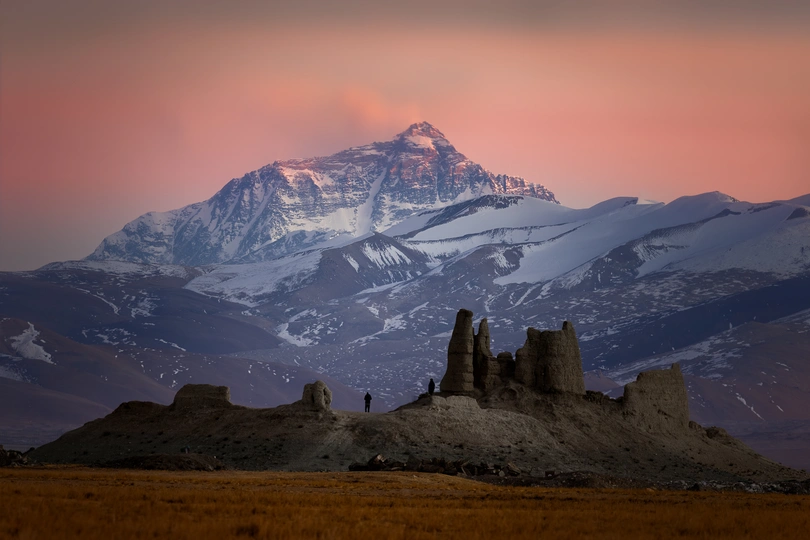 天色转为柔和的粉紫,珠穆朗玛峰在云雾与余光中显现。它并未以高度压迫视线,而是在暮色中稳固地存在。古堡与草原退居前景,成为通向圣山的沉默铺垫。此刻,珠峰不需要被仰视,只需要被承认。