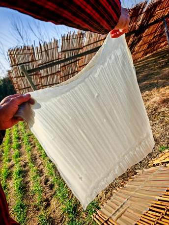 暖融融的日光里,老农的双手轻轻抻着半干的粉皮 —— 那透亮的白里裹着细密的纹路,像被阳光浸软的玉帛,还沾着些未散尽的湿润水汽。竹架上还铺着一些同款的粉皮,风一吹,软润的边角轻轻晃,裹着烟火气的暖意,都浸在这张半透的薄皮里了。