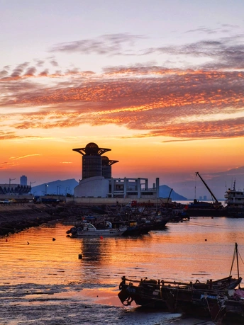 橙红与粉紫晕染的晚霞铺满天际,像被点燃的云絮层层叠叠。港湾里的水波浸着落日的金辉,晃出细碎的光 —— 几艘渔船或泊在水面,或搁浅在滩涂,船身的轮廓裹着暖调的朦胧。远处那座带穹顶的建筑在霞光里立成独特的剪影,旁边的吊机与城市楼宇隐约错落,山影也浸在这黄昏的柔色里,整幅画面裹着渔港特有的烟火气,又晕着晚霞给的浪漫滤镜。