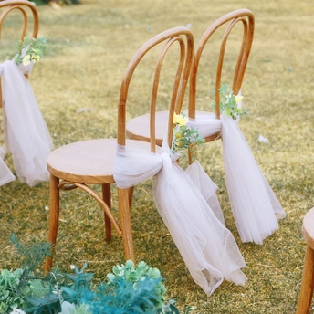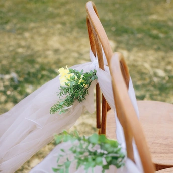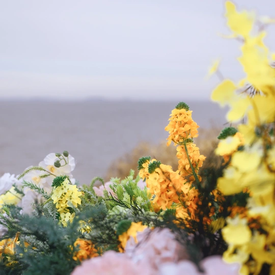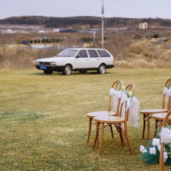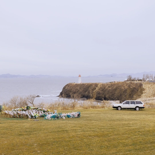 寒风呼啸,草坪婚礼的场地一片寂静。绑满鲜花的架子颓然倒在地上,简易的教堂建筑孤零零地伫立在悬崖边。排列整齐的座椅静静摆放着,椅背上披着鲜花纱巾,旁边停着一辆装满鲜花的小轿车。一切都显得那么孤寂,仿佛这里正在举办一场无人参加的婚礼。