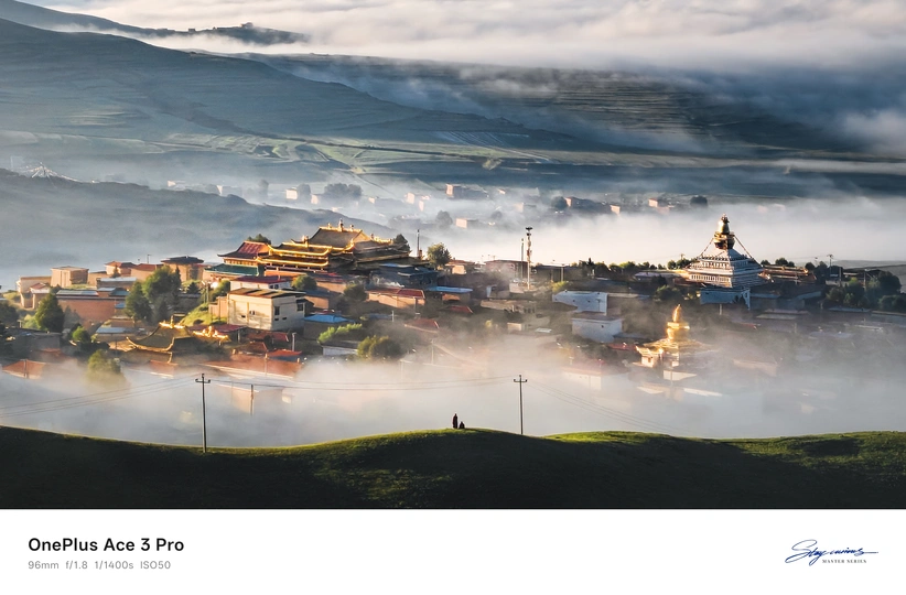 山脊如刃,割开云海与尘寰。一袭赭衣的僧人 独行于嶙峋石径,衣袂翻涌处,雾浪随之浮 沉。身后古寺飞檐刺破云层,金顶在晨光中若 隐若现,恍如悬于天际的梵钟。