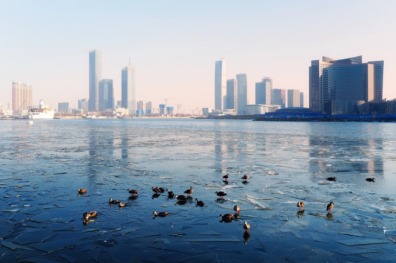 寒冬的海河碎冰上,野鸭群栖落,对岸的滨海高楼在晨雾里静默成画。