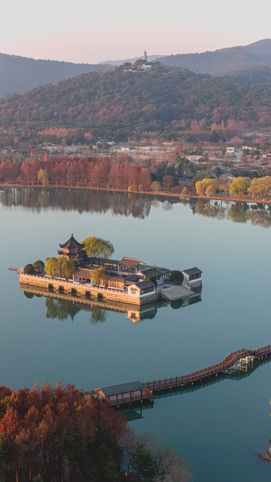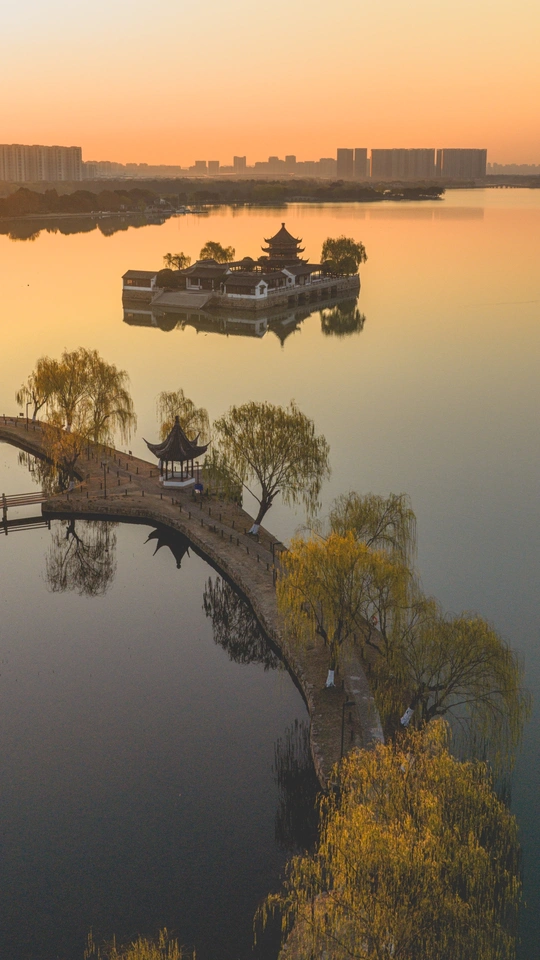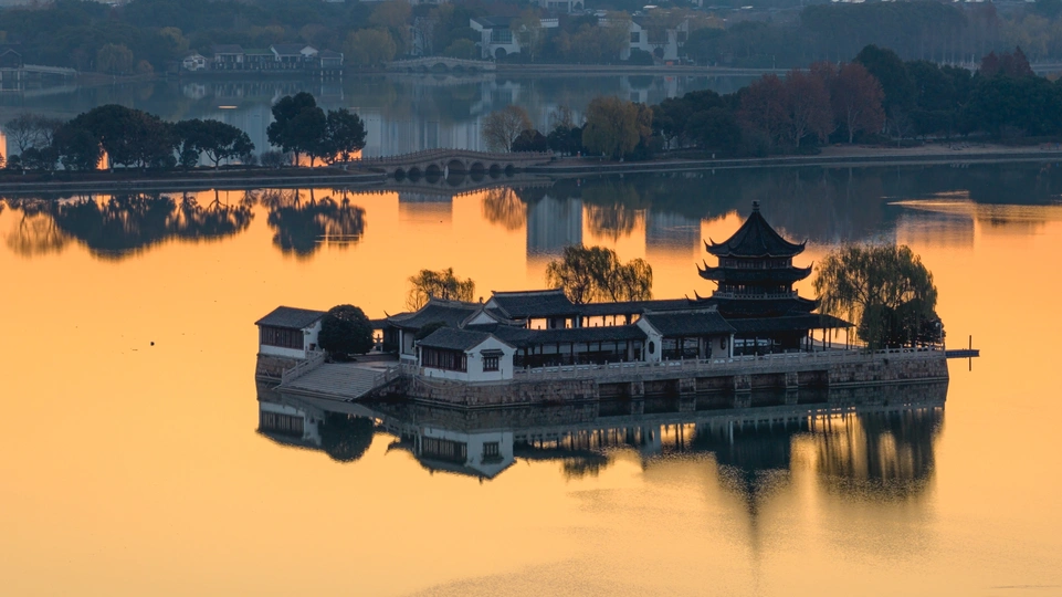 清晨的石湖天镜阁,如同镜面一般,水面泛着金光