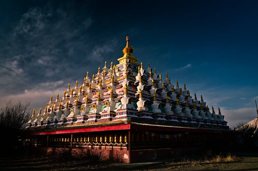 蓝天下的佛塔像座会呼吸的金山,每片彩釉都盛着光的余烬——五年前在藏区支教,偶然撞见这塔,老喇嘛说它是‘百塔归一’,每尊小塔都藏着个祈福的魂。那天夕阳把金顶烧得透亮,转经筒哗啦响,我盯着光影在砖上爬,突然懂了:有些震撼,是神明把信仰碾成了光,撒在你眼里。