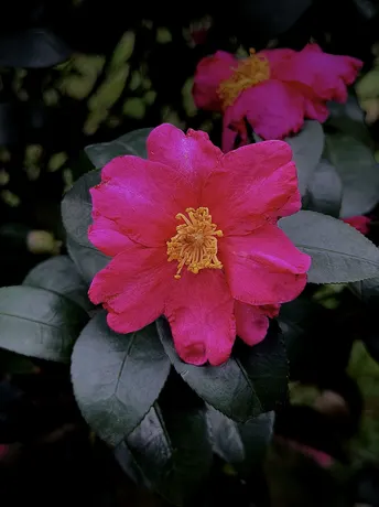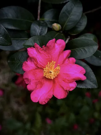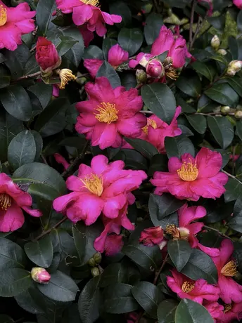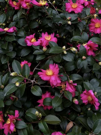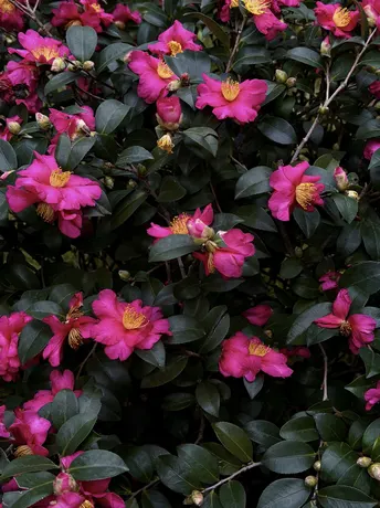 茶梅在冷风中舒展身姿,花瓣层层叠叠,深绿的叶簇拥着艳粉的瓣,金黄的花蕊在中心微微舒展,像把攒了一整个秋天的温柔,都揉进了这冬日的绽放里。