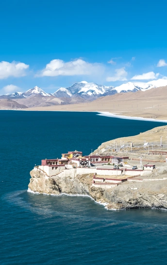 普莫雍措旁的推寺,雪山圣湖的优美画卷。