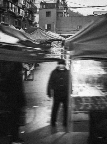 清晨上班的路上,坐公交车路过菜市场的路口,正好手机镜头里出现了一个身影,我按下快门,记录下这样一幅画面。