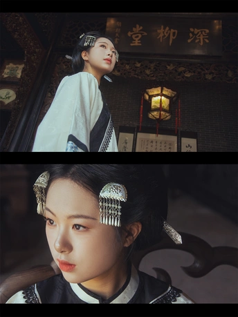 在深柳堂的光影里,把自己活成了民国旧梦的女主角。 素衣黑襟,三齿银簪斜斜插入鬓发,流苏随着抬眼的动作轻轻摇晃。 这枚三叉簪子不是简单的发饰,更像一把钥匙,打开了古宅里尘封的故事感。 出镜:与蔚