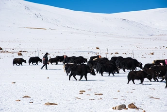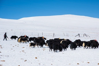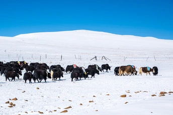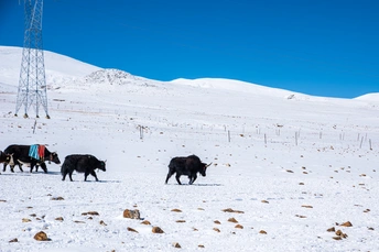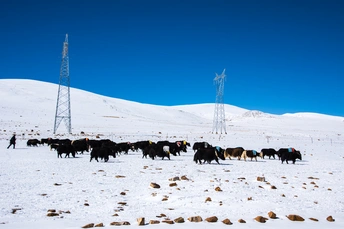 当阳光把西藏北部的雪野晒得发烫,牦牛群便像流动的墨色,在纯白天地间缓缓铺展。牧民踩着没踝的积雪,身影在旷野里显得渺小,却又带着与这片土地共生的笃定。黑亮的牦牛毛上凝着雪粒,走起来就像一团团移动的乌云,偶尔露出的白色臀斑,又像雪地里落了颗碎星。 远处的输电铁塔刺破蓝天,现代的金属骨架与原始的牧歌场景在此相遇,却丝毫不显突兀。高原的风卷着雪粒掠过,牦牛们低着头稳步前行,它们厚重的皮毛下藏着应对严寒的坚韧,一如世代在此生息的牧民。 在这片离天空最近的土地上,古老的游牧方式并未远去,它与时代的脉搏一起跳动,让每一步迁徙都成为生命与自然的对话。
