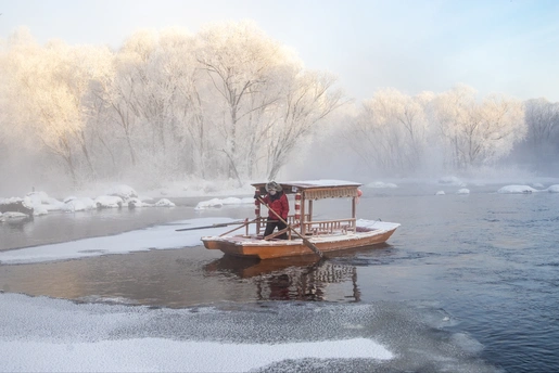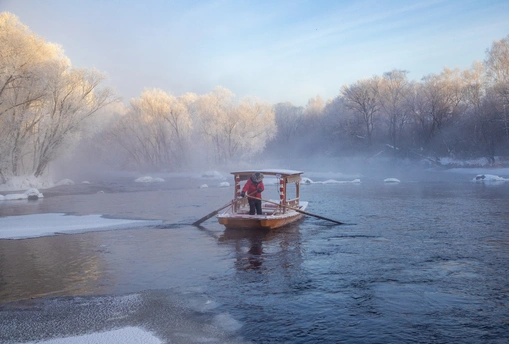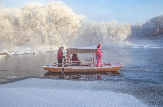 逊克大平台雾凇景区,北境极寒之地的人间仙境。清晨,尽管已是零下三十度的凛冽极寒,库尔滨水库的水电站带来的的活水却使得河面常年不冻。独特的天时地利人和,使得这里的雾凇效果远比吉林雾凇更为出彩。 景区的游船在平静的水面上悠然前行,游人和船夫大概早已习惯了这里的寒冷。