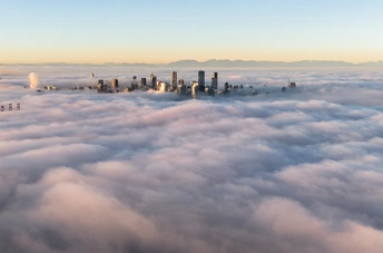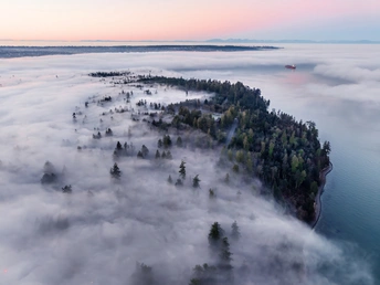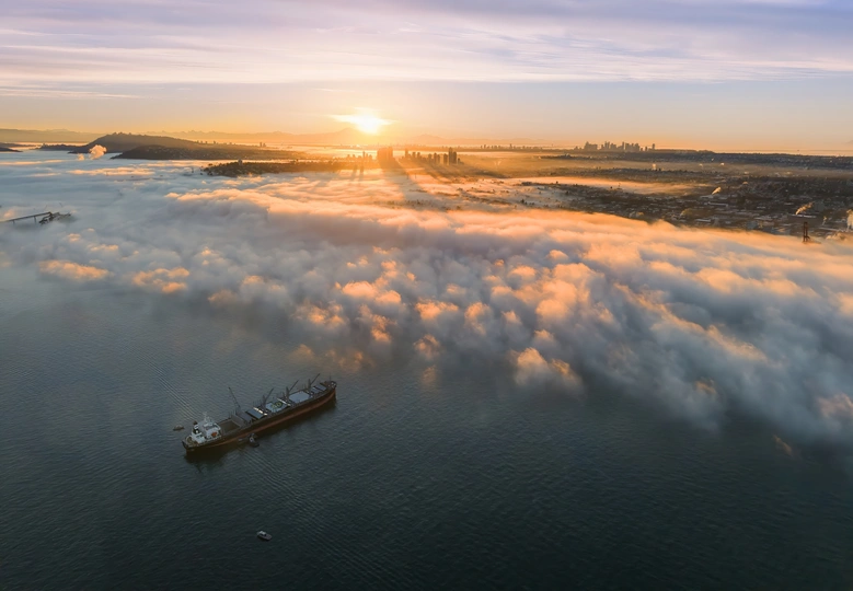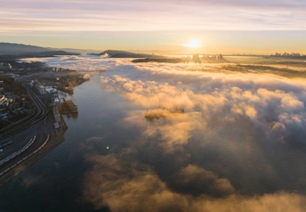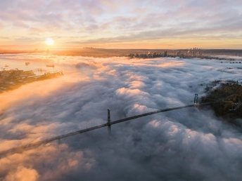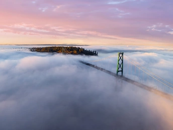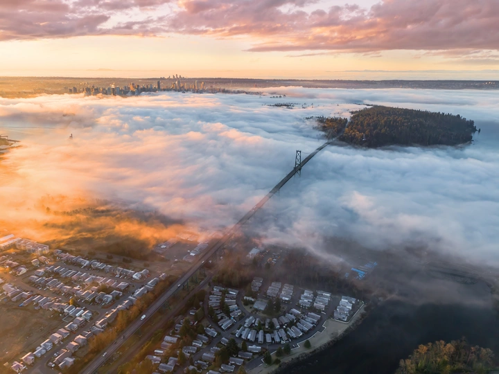 冬日的晨曦,温哥华还在深蓝色的梦境里徘徊。狮门大桥的钢索率先触到一丝暖金,像被捻亮的琴弦。忽然,天光熔开一道缝隙,金红的岩浆倾泻而下,漫过卡佩兰奴峡湾沉睡的云毯。远山如青黛的剪影,而云海正翻滚着,从铁灰渐次染作绯金、橘粉,最后蒸腾起一片透明的薄紫。城市在下方渐渐显形,仿佛刚从这片柔软的、流动的绒被里苏醒。