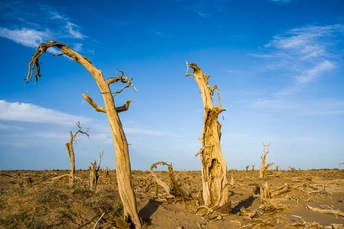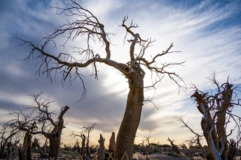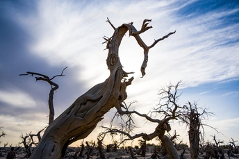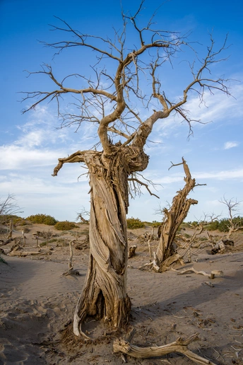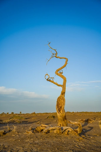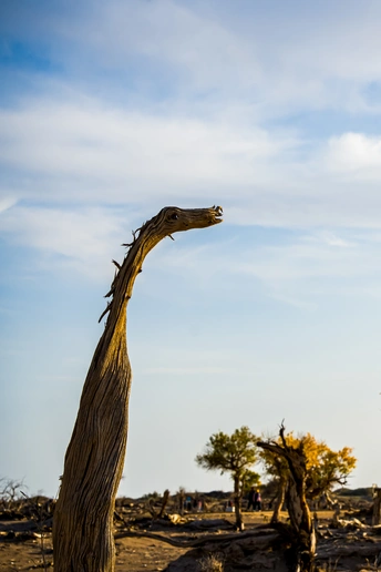 在额济纳的荒漠里,风是这里唯一的信使,而枯立的胡杨,是它留下的信笺。 我站在一片沉默的树林里,脚下是细沙,头顶是洗过一样的蓝天。那些胡杨枯树以最倔强的姿态挺立着,扭曲的枝干像凝固的闪电,皲裂的树皮里裹着千年的风。它们或许已经死去百年,却依旧不肯倒下,把枝桠刺向天空,仿佛还在向岁月追问着什么。 阳光落在木头上,泛着温暖的金褐色,和蓝天撞出强烈的色彩。远处零星的绿与枯木的褐、天空的蓝交织,让这片死寂的荒漠有了层次。没有一片叶子,却比任何枝繁叶茂都更震撼人心。 它们是时间的纪念碑,活着千年不死,死后千年不倒,倒后千年不朽。站在这里,你会忽然明白,生命的力量从不是以存活时长来衡量,而是以它在天地间刻下的痕迹来证明。