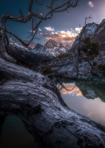 当枯木以永恒的姿态横卧湖畔,雪山便成了它的背景。千年风雨刻下的纹理里,藏着这片土地最沉默的故事。黄昏将云朵染成温柔的橙粉,又把这份色彩完整地交给湖水,让雪山与晚霞在镜面相拥。风掠过枝桠时,没有声响,只有倒影轻轻晃动,仿佛时间也在这里放慢了脚步,甘愿与朽木、雪山、湖光一同,沉醉在这凝固的黄昏里。