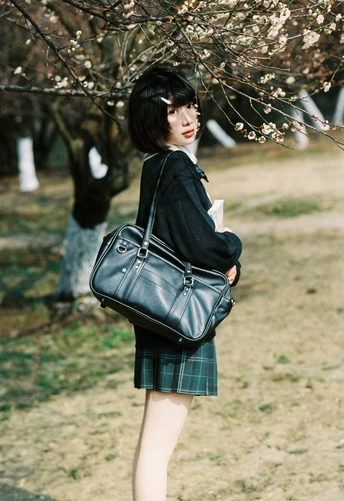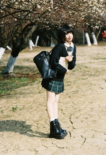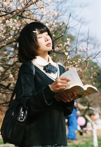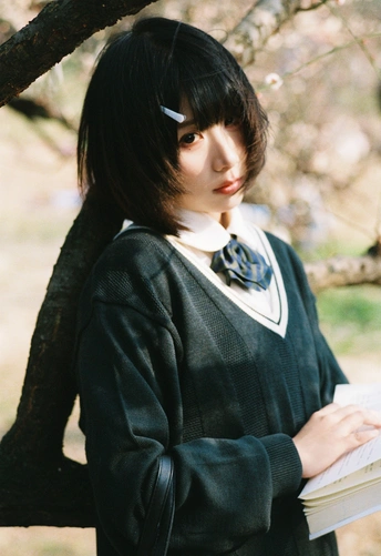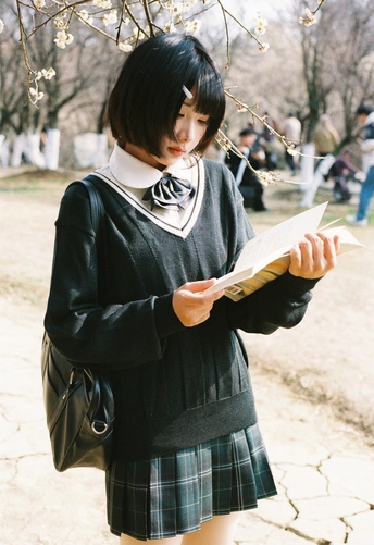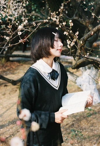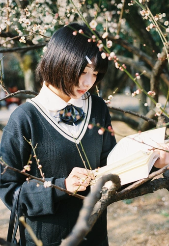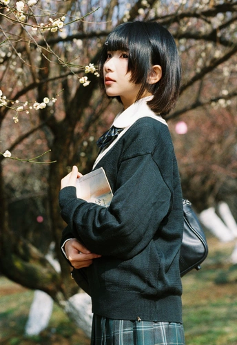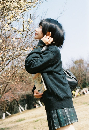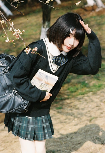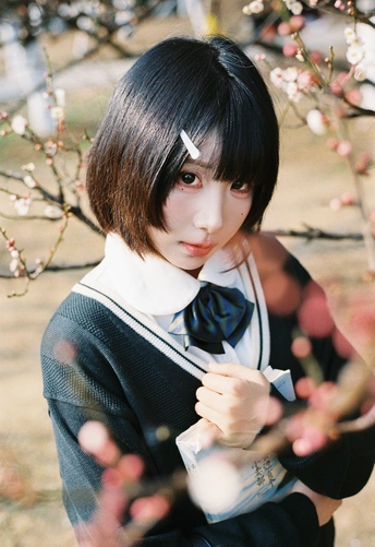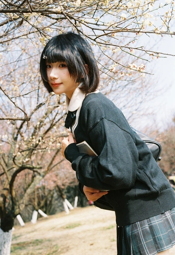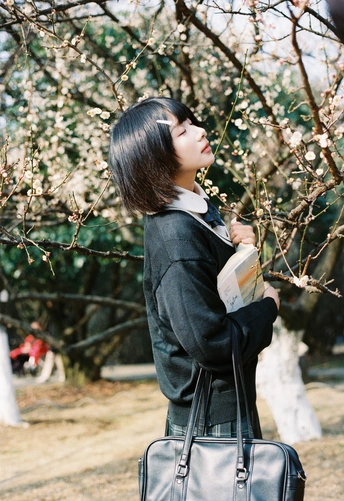 设备:康泰时g1 胶卷:富士400 阳光是软的,顺着白梅枝桠漫下来,落在她的短发梢上。黑毛衣裹着恰好的温度,领结松松垂在颈边,怀里的书本还带着纸页的糙感,连风掠过裙摆的弧度都慢了——像课间偷跑出来的十分钟,被花影和轻软的呼吸,一起封进了春日的胶卷里。
