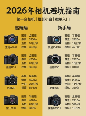 新手别焦虑!老鸟不纠结!这篇帮你精准匹配第一台相机✨ 🚀【高端玩家局】性能强悍+价格可控 1️⃣ 索尼A7M4 2026年依然真香!视频拍照双修首选 2️⃣ 佳能R5 II 风光党&视频创作者终极梦想机 3️⃣ 尼康Z8 高像素+高速连拍,打鸟风光双修首选 4️⃣ 富士X-H2 地表最强半画幅!胶片模拟直出王者 🎈【新手入门局】轻便高性价比 1️⃣ 佳能R50 vlog神机!小白操作界面友好到哭 2️⃣ 索尼ZV-E10 美颜+带货模式,博主自拍生产力工具 3️⃣ 尼康Z30 耐造便携+直出色彩绝,旅拍扫街神器 4️⃣ 佳能EOS 200D II 学生党&家庭用户首选!翻转屏+超轻机身 💡选购真心话 ✅新手:重量+续航>参数!从R50/Z30开始练手不心疼 ✅高端:索尼A7M4/富士X-H2性能溢出却不到2W!真香警告⚠️