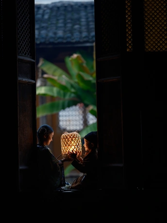 暮色漫过古宅的檐角,竹编灯笼暖黄的光,在蕉叶的剪影里轻轻摇晃。 两个身影被框在木门之间,指尖相触的温度,让幽暗的角落盛满了温柔。 这盏灯,是岁月里不肯熄灭的烟火,也是寻常日子里最动人的陪伴。