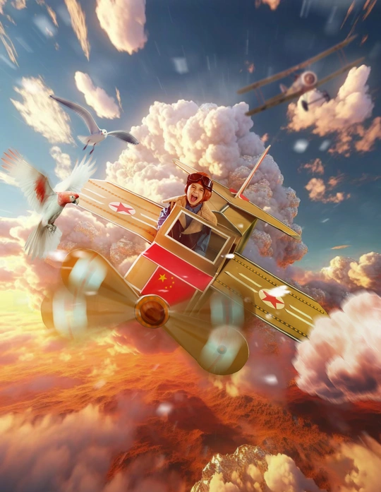 当纸飞机的幻想长出引擎,少年便成了自己天空的主宰。 他戴着复古飞行镜,驾驶着涂满金色与红星的双翼机,在棉花糖般的云团里穿梭。身旁的鹦鹉与海鸥是旅伴,远处的老式飞机是同路人,脚下是翻涌的橙红云浪,头顶是澄澈的蔚蓝苍穹。 这不是梦境,是把童年的勇气与热爱,直接开进了云端里