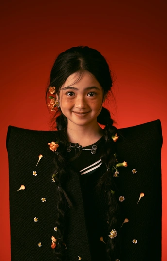 浓烈的赤红背景,像一团温柔燃烧的火,衬着一身棱角分明的黑。 麻花辫里坠着细碎的花,花瓣在面料上随性散落,是冷硬轮廓里藏不住的柔软生机。 少女的笑容带着雀斑的俏皮,在红与黑的碰撞间,让青春的热烈与清甜,都有了具象的模样。