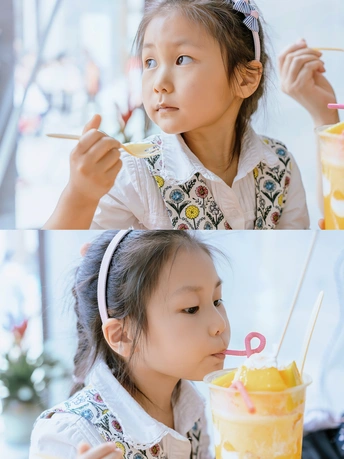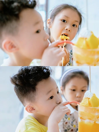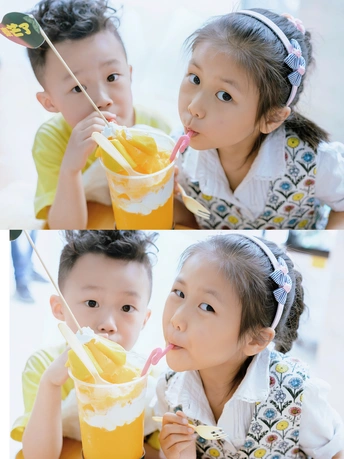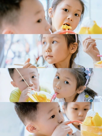 ▫️芒果冰沙组:阳光穿过落地窗,在孩子们的脸上打出温柔的光斑。 ▫️抓拍重点:用大光圈虚化背景,把孩子们吃冰时的满足表现出来