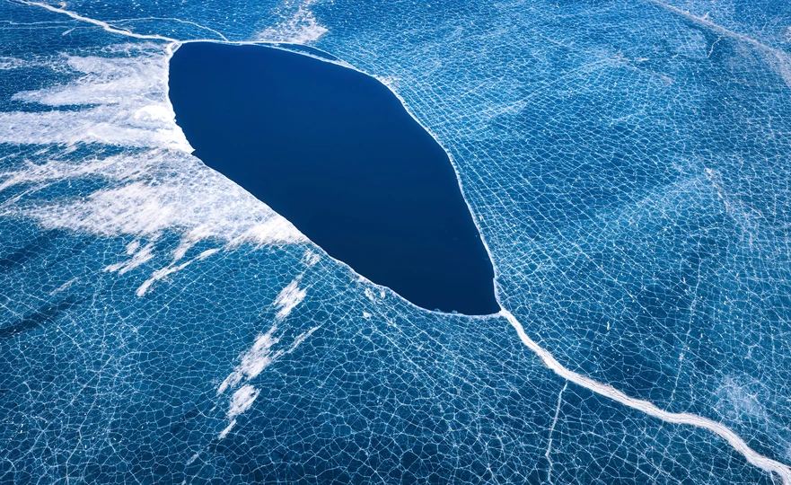从高空俯瞰,这片冰封的湖面如一块碎裂的蓝玉,千万道冰纹在澄澈的冰面蔓延开来,如同大地的脉络。中央那处深蓝色的未冻水域,形状酷似一颗心脏,在冰封的世界里搏动着生命的温度。白色的冰痕如细密的血管般环绕四周,与深邃的蓝形成强烈的视觉张力。这幅作品以独特的上帝视角,将冰原的辽阔与 “心脏” 的隐喻结合,在极致的冷色调中,藏着自然最浪漫的心跳。