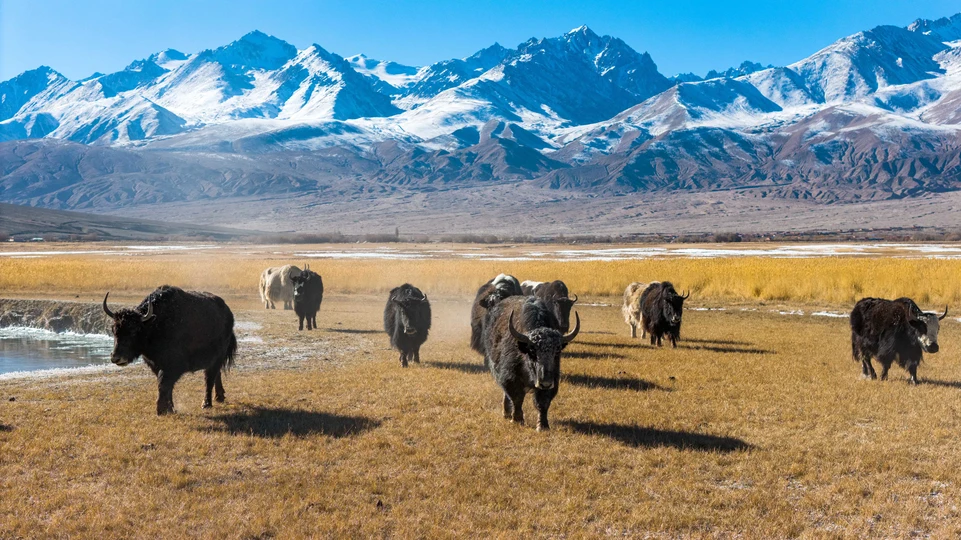在帕米尔高原的旷野上,暖阳为枯黄的草甸镀上暖金,成群的牦牛正踏着尘土向前行进,黑褐与乳白的皮毛在光影里泛着厚实的光泽。远处的雪山如凝固的浪涛,在湛蓝天空下绵延起伏,山脚下的湿地与残雪为辽阔的荒原添了几分灵动。这幅画面以开阔的视角,将高原生灵的野性与雪山草甸的壮阔融为一体,在凛冽的天地间,奏响一曲充满生命力的牧歌。