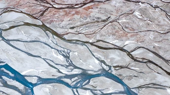这是一幅从高空俯瞰的湿地地貌,蓝褐相间的河道如大地的血管,在浅灰的滩涂上肆意蜿蜒、交织,最终汇成一片细密的水网。浅粉与赭红的色块晕染在滩涂边缘,仿佛大地皮肤下透出的血色,为这片肌理增添了温暖的层次。画面中,流动的水脉与凝固的滩涂形成鲜明对比,既像天然的抽象油画,也如地球的生命图谱,展现出自然造物的细腻与壮阔。